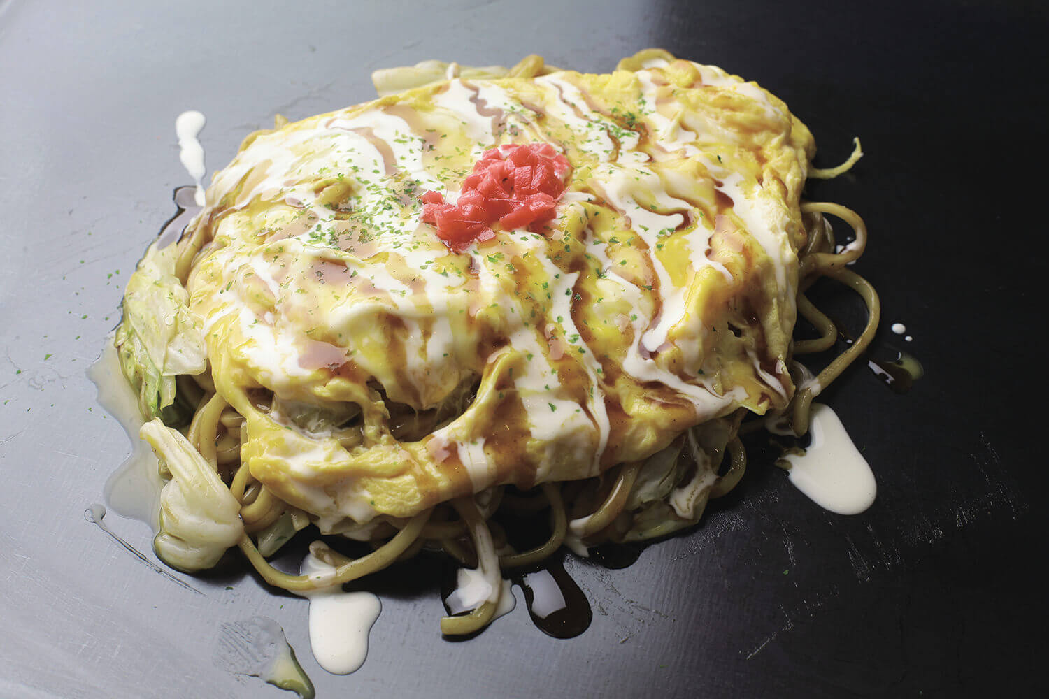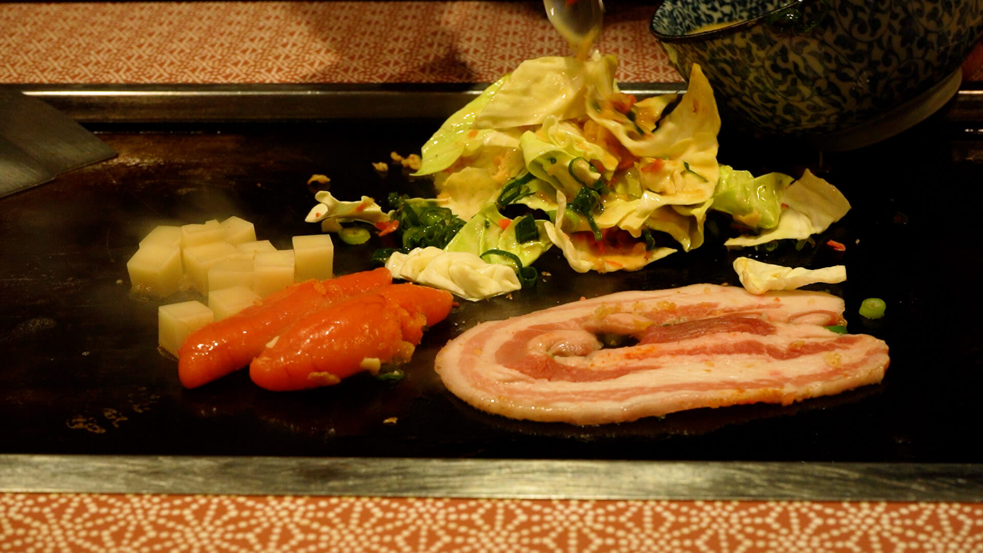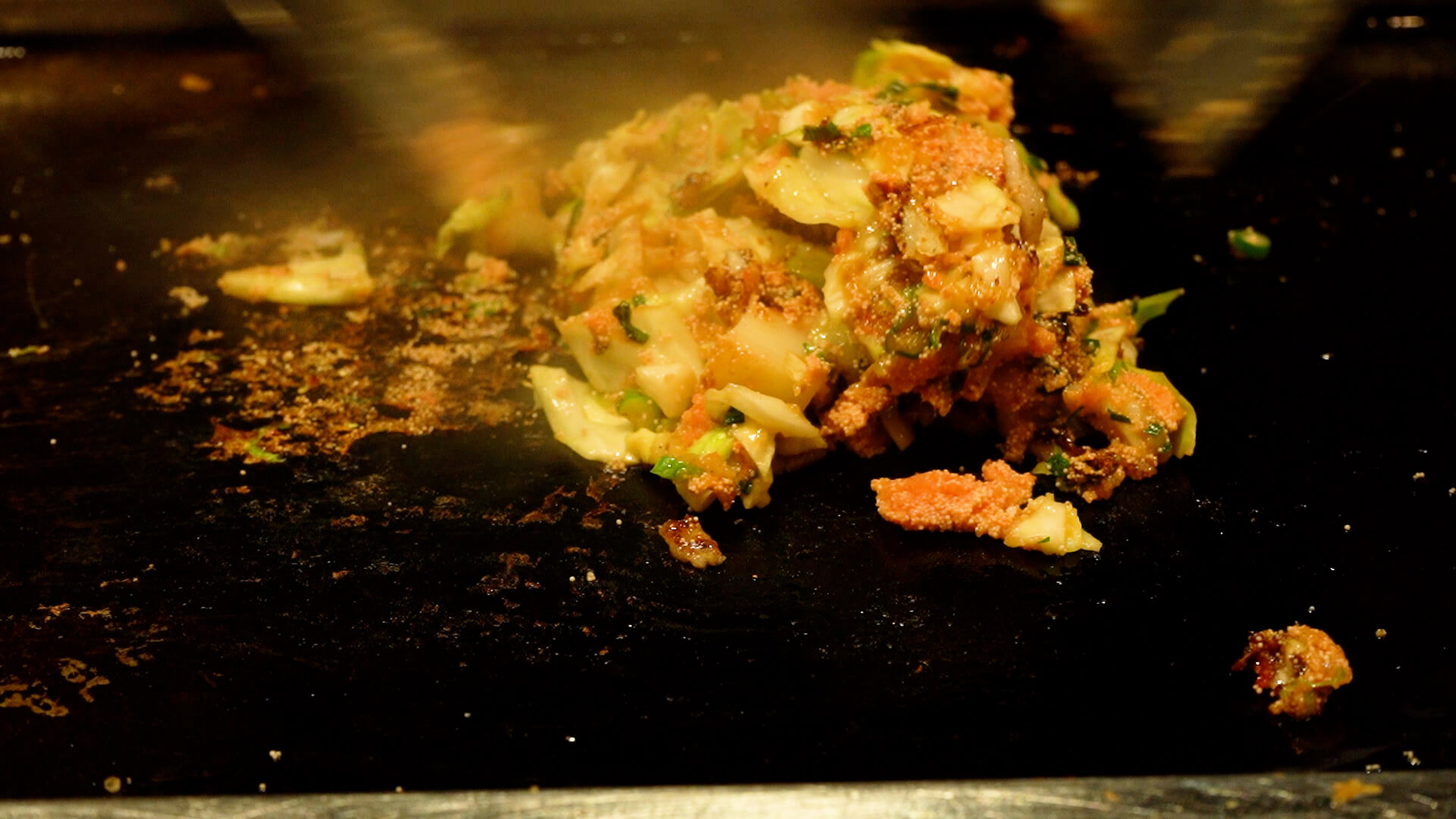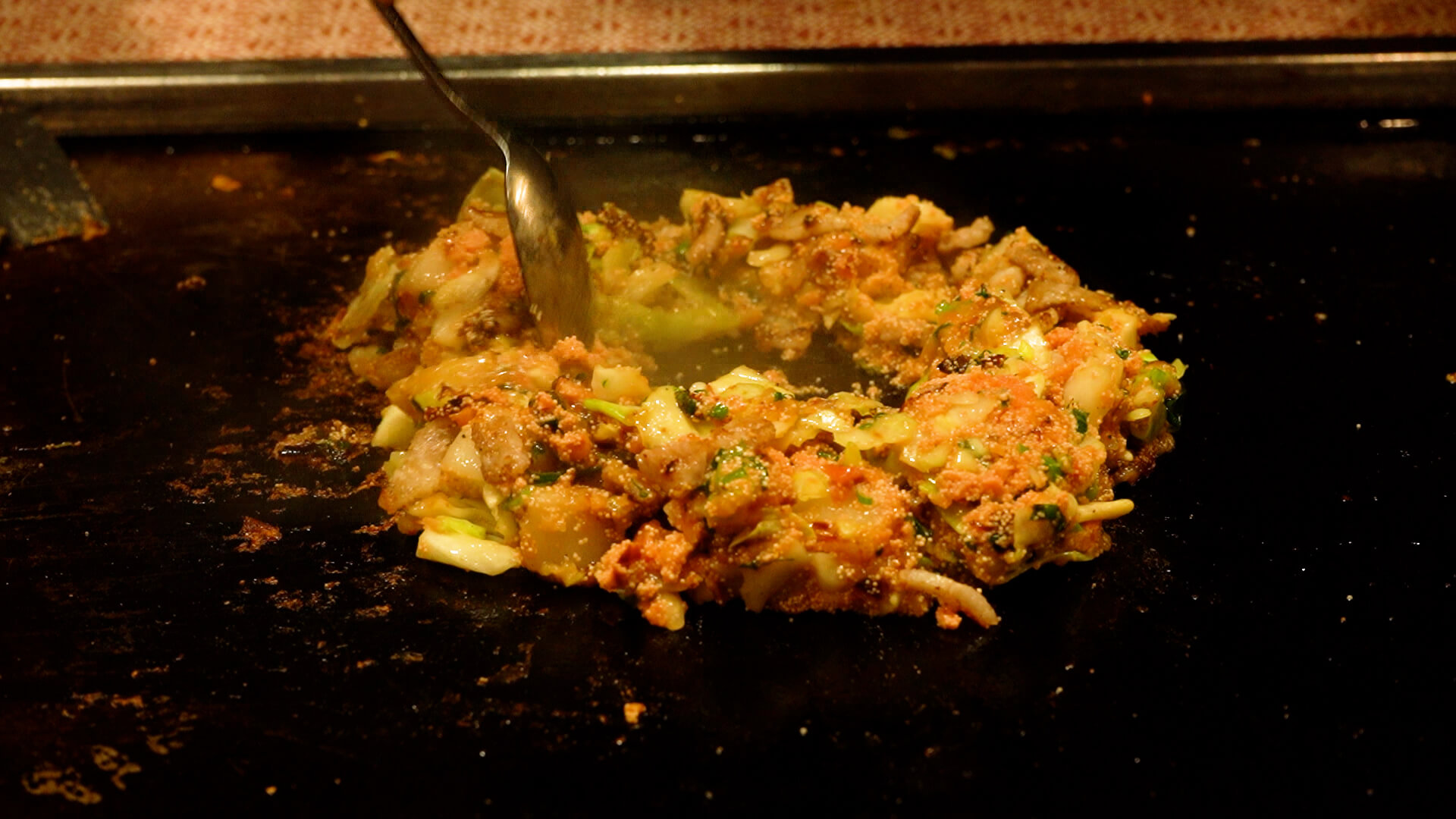 出汁を残すようにして具だけを鉄板の上に出し、キャベツがしんなりするまで炒めます。