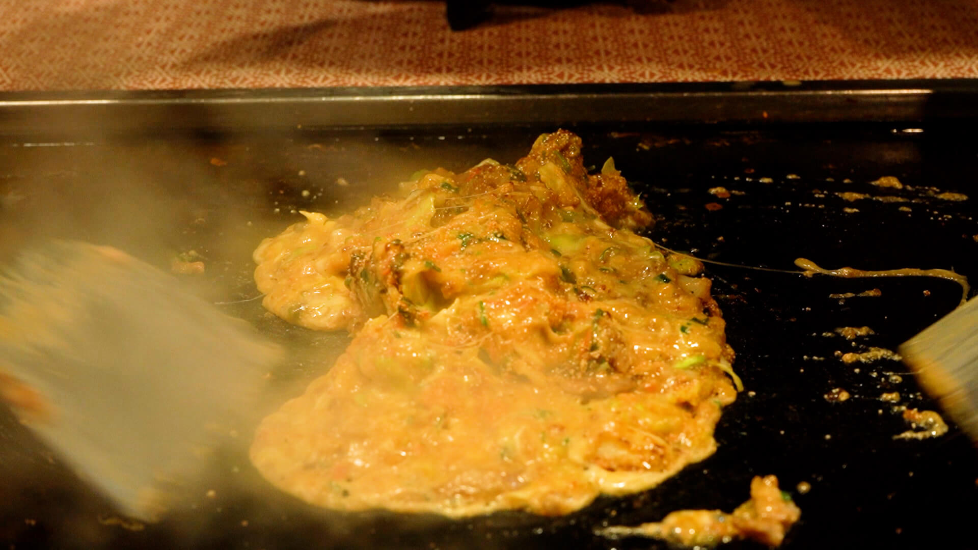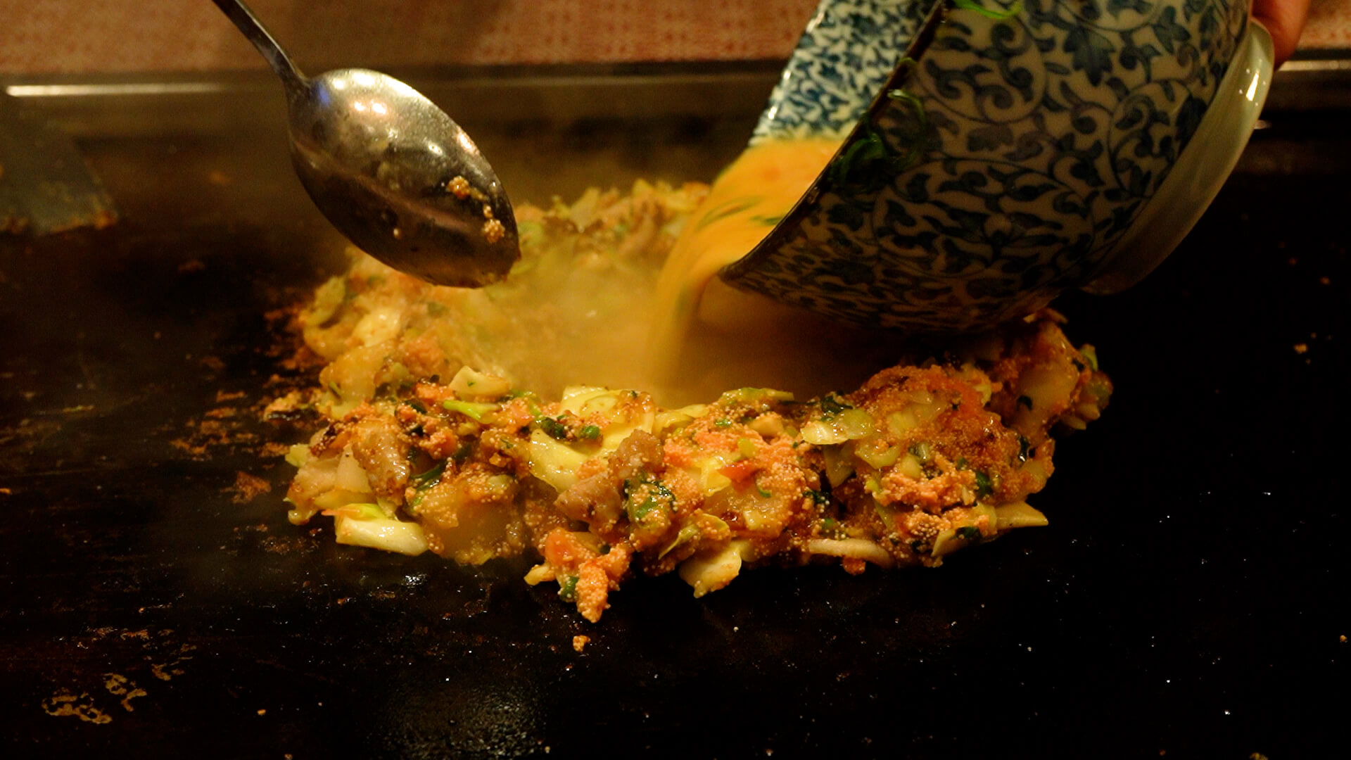 もんじゃ焼の器の中の出汁と具をよくかきまぜ、加熱した鉄板に、うすく油をひき、流し込みます。