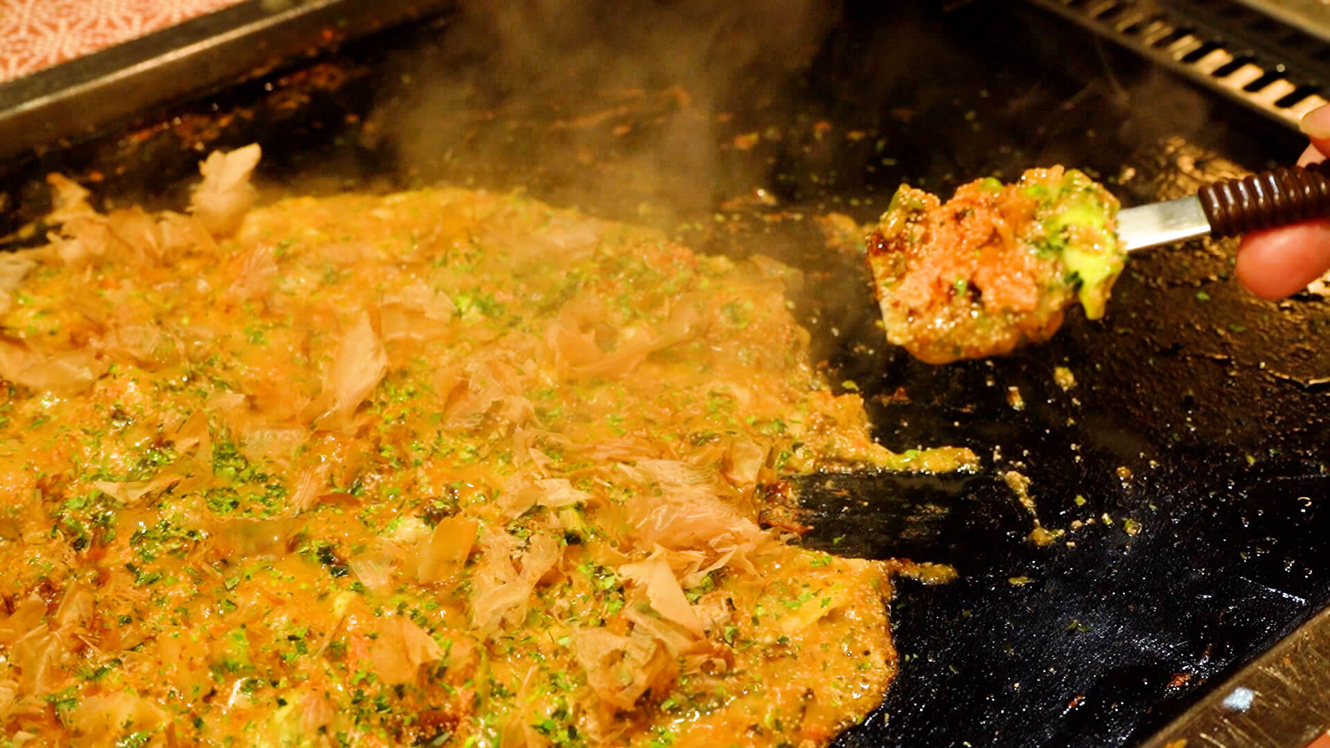 薄くひろげてできあがり。「はがし」(極小ヘラ)を使い、 外側から少しづつかき取るよう鉄板に押しつけ、"はがし" にくっつけてお召し上がりください。